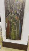 Medium: Oil, Acrylic, Found Ephemera, String, Wire and Lightbulb on Wood Plank