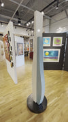 These totems are formed from steel into the waved shapes corresponding to harmonic sound frequencies. These Duet series have two units that relate to one another and mount together into a single unit. Each is one of a kind and can be displayed in our outside.